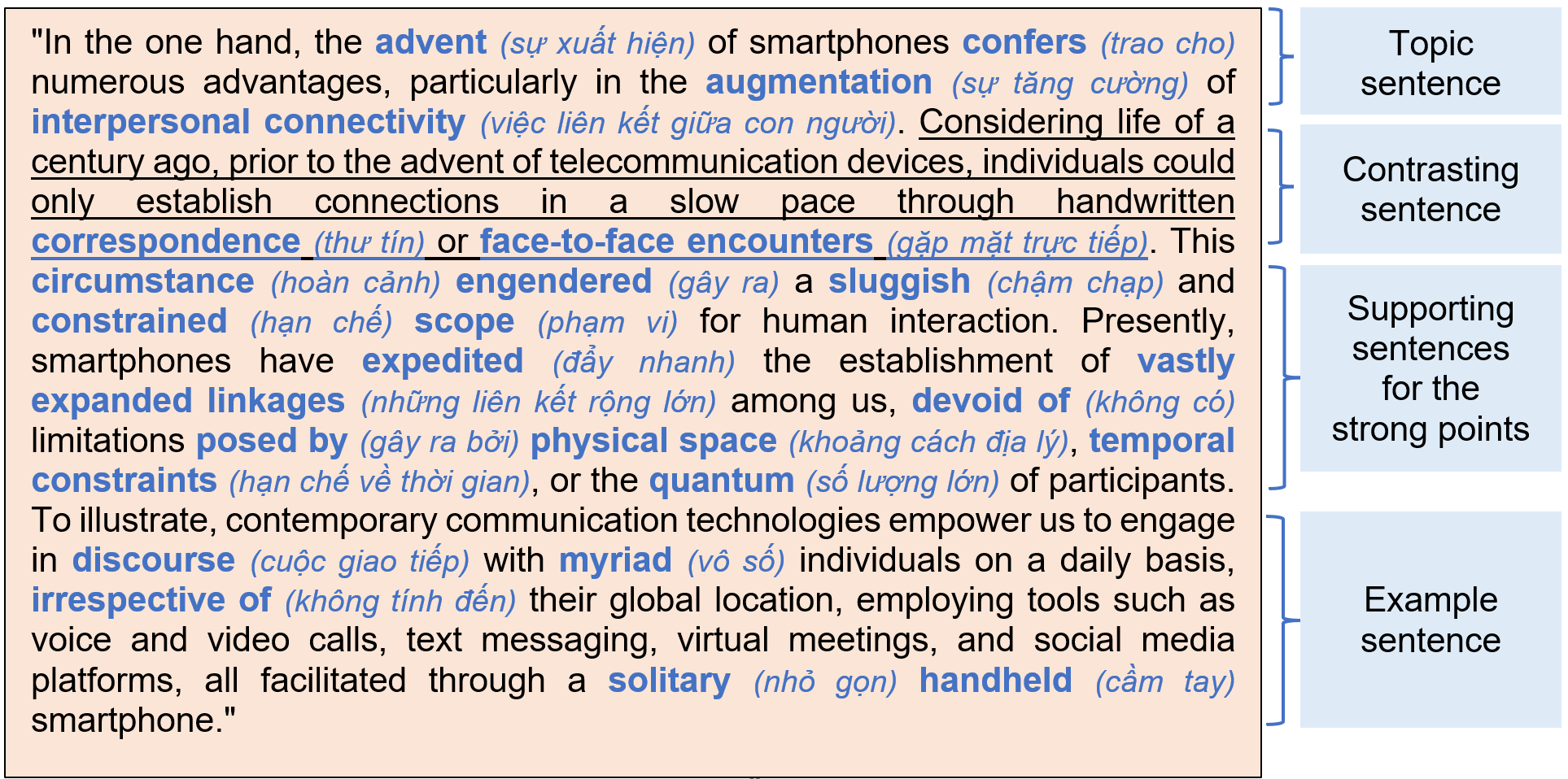 Bản dịch tiếng Việt: “Ở mặt thứ nhất, sự xuất hiện của điện thoại thông minh mang lại nhiều lợi ích, mà đặc biệt là nó giúp con người trở nên kết nối tốt hơn với nhau. Hãy tưởng tượng cuộc sống của một thế kỷ trước khi chưa có điện thoại, người ta chỉ có thể kết nối với nhau một cách chậm chạp qua thư viết tay, hoặc gặp mặt trực tiếp. Điều đó đã khiến phạm vi và tốc độ kết nối giữa con người trở nên rất chậm chạp và hạn chế. Ngày nay điện thoại thông minh đã giúp chúng ta kết nối với nhau ở một phạm vi rất rộng, không bị hạn chế bởi không gian, thời gian, hay số lượng người kết nối. Ví dụ như chúng ta có thể trò chuyện với hàng nghìn người mỗi ngày từ bất cứ nơi nào trên thế giới bằng cách gọi điện thoại bằng giọng nói, điện thoại bằng video, tin nhắn, hội nghị trực tuyến, hay thông qua các mạng xã hội, v.v. chỉ cần một chiếc điện thoại thông minh.”