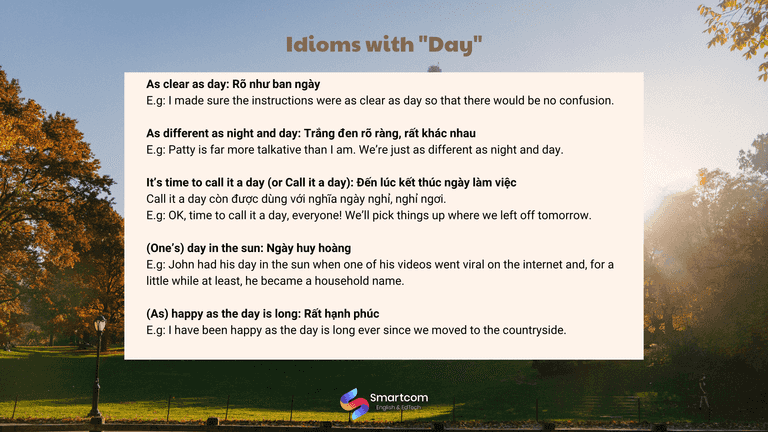 Bạn muốn tăng từ vựng và thành ngữ tiếng Anh để giao tiếp như người bản xứ? Đừng lo lắng, hãy để Smartcom English giới thiệu tới bạn một số thành ngữ tiếng Anh liên quan tới “DAYnhé.
