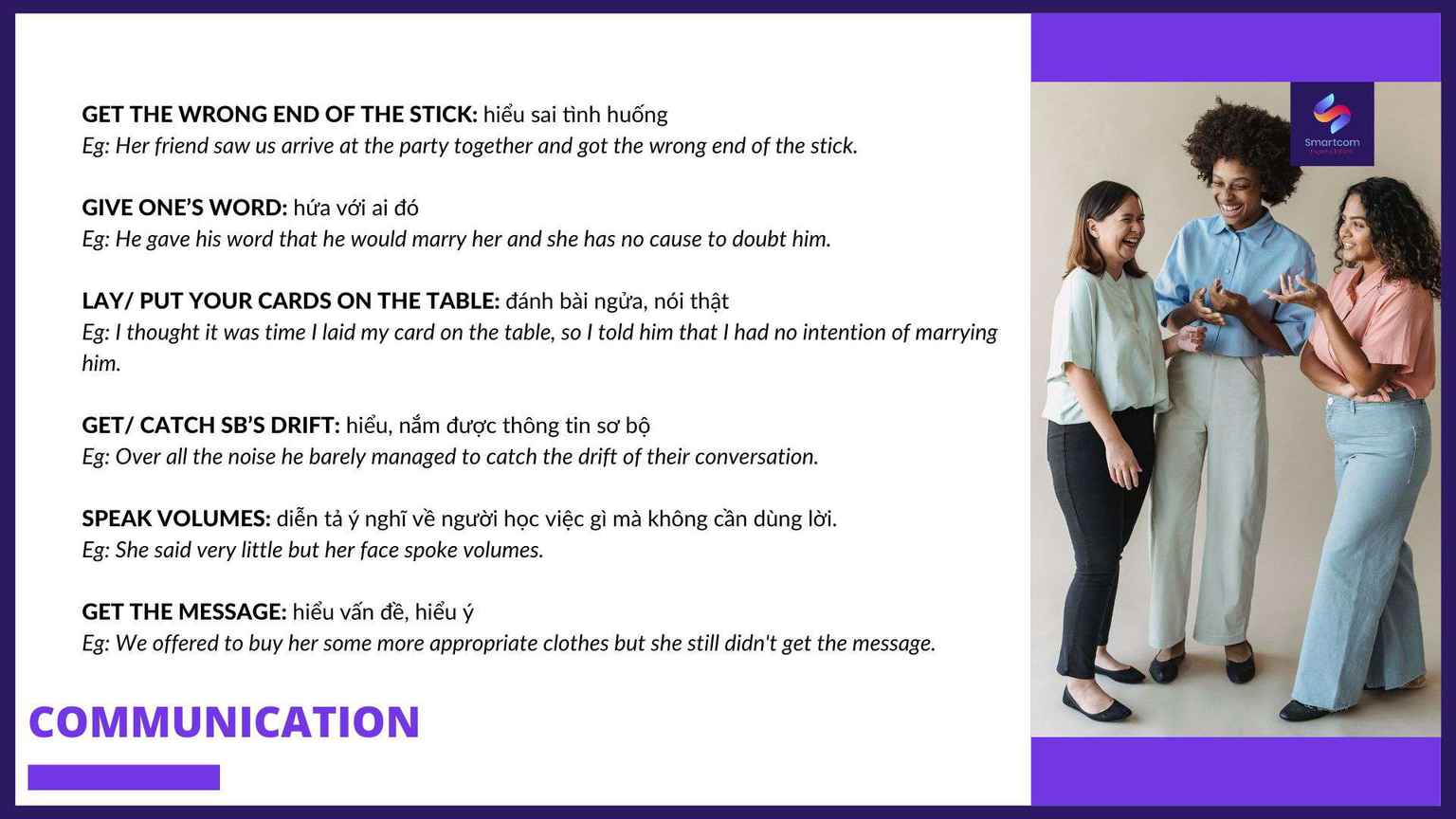 Bài viết này sẽ cho bạn những cách diễn đạt thú vị về cụm từ và thành ngữ chủ đề COMMUNICATION để nói những ý như: tình ngay lý gian, hoặc hiểu sai tình huống (GET THE WRONG END OF THE STICK), dành cho ai lời hứa của mình (GIVE ONE’S WORD), nói toạc móng heo ra hoặc là chơi bài ngửa (LAY/ PUT YOUR CARDS ON THE TABLE), hay nắm được thông tin cơ bản rồi (GET/ CATCH SB’S DRIFT), và ý tứ đã lộ hết ra mặt rồi, chẳng cần phải nói cũng biết (SPEAK VOLUMES).