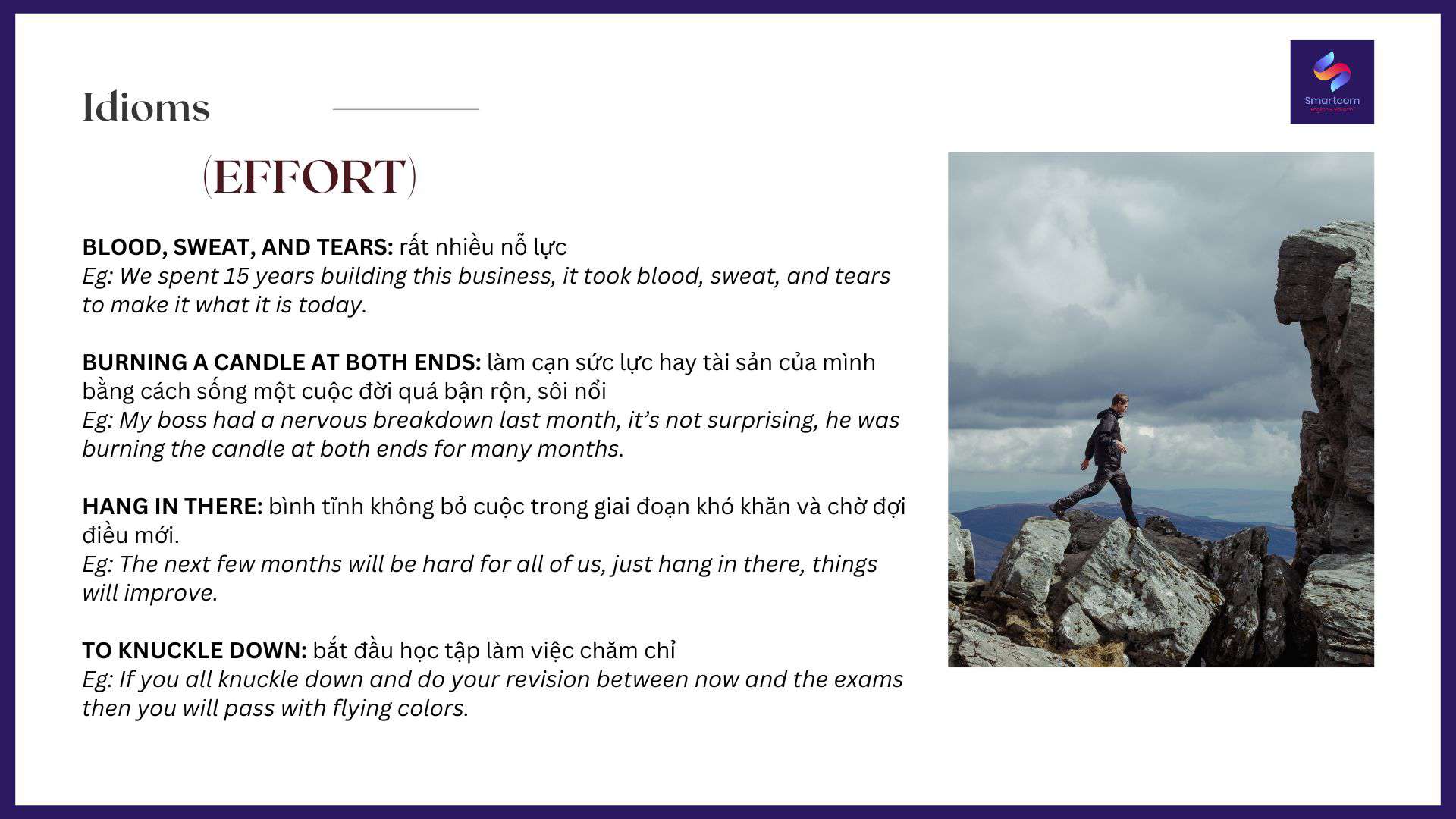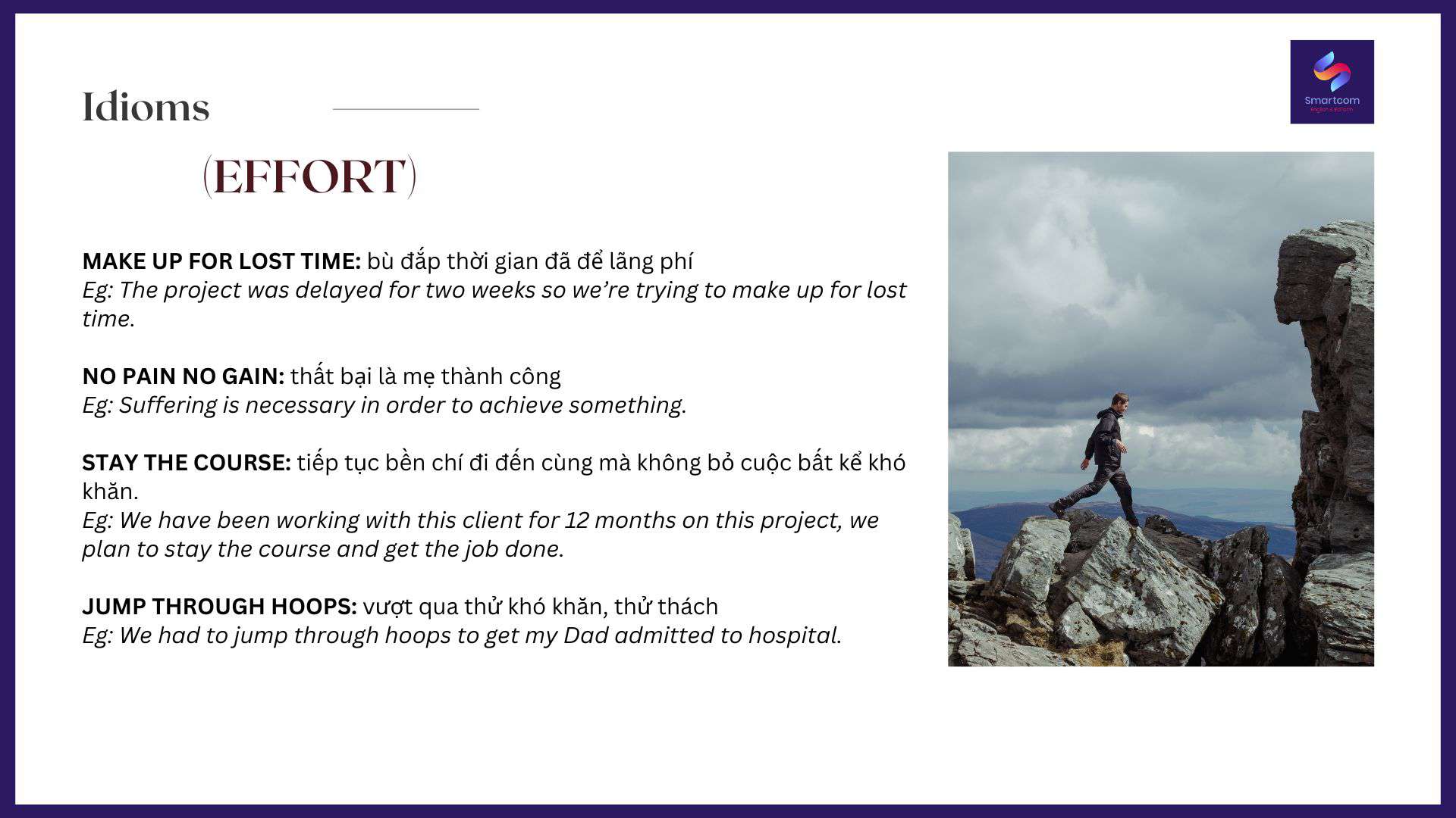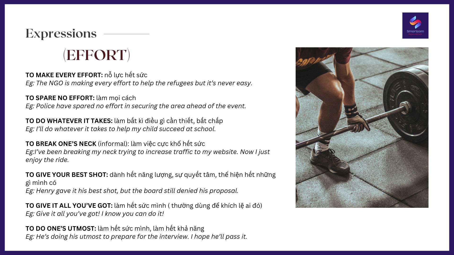 Nói về cố gắng hay nỗ lực, thì tiếng Anh có nhiều cách diễn đạt chẳng thua kém gì tiếng Việt. Smartcom English sẽ chia sẻ với các bạn các cách diễn đạt về sự nỗ lực trong tiếng Anh, giúp làm phong phú vốn diễn đạt của các bạn nhé: