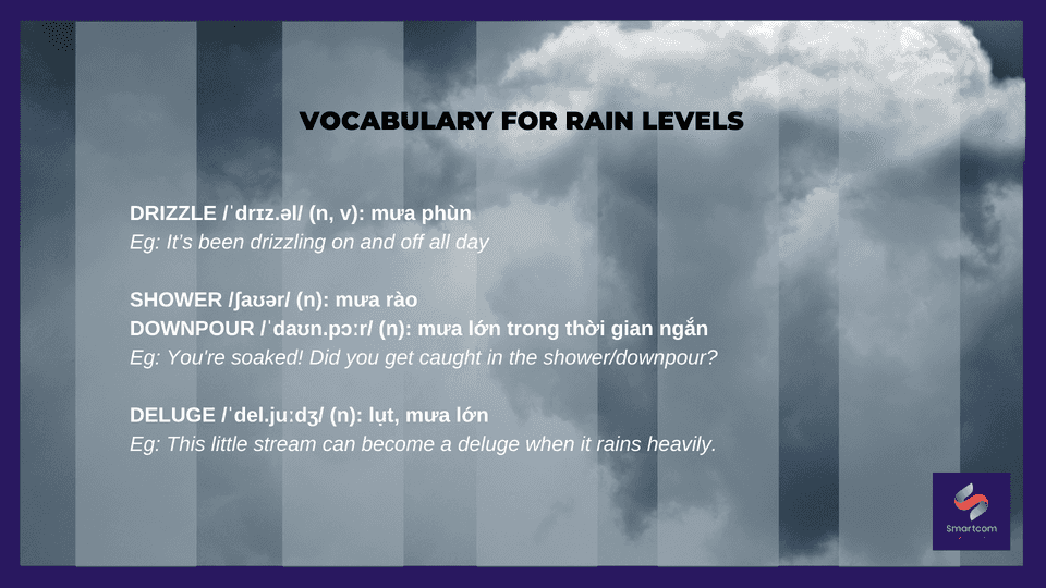 Bắt đầu đi từ nhẹ nhàng trước nhỉ, nếu là mưa phùn chúng ta dùng từ “DRIZZLE”, còn nếu là mưa rào thì có thể dùng từ “SHOWER” hoặc từ “DOWNPOUR”. Còn nếu là mưa lớn, nặng hạt, và xối xả, thì ta dùng cụm từ “RAIN CATS AND DOGS”, nôm na hiểu là mưa ầm ầm, như chó (sủa) mèo (gào). Còn nếu ta muốn bảo là mưa nhiều, mưa lụt, thì dùng từ “DELUGE” nhé!