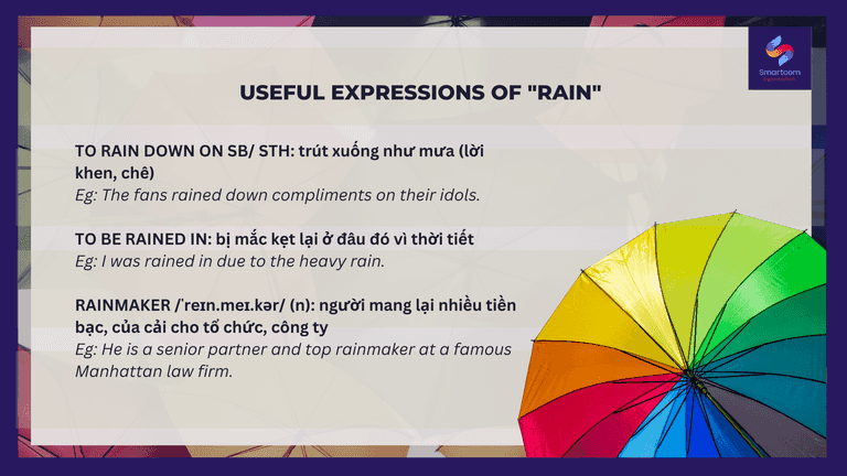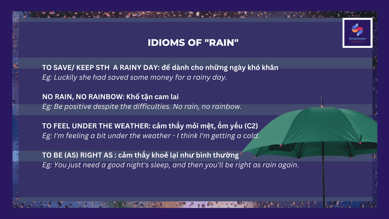 Thêm nữa, có những từ chúng ta gắn với từ “mưa”, ví dụ “mưa lời khen/chê” cho ai thì ta dùng cụm “TO RAIN DOWN ON SB/STH”. Còn bị mắc kẹt ở đâu đó vì thời tiết (nắng quá, mưa quá, bão bùng…) thì cũng dùng cụm từ “BE RAINED IN”. Và đôi khi ta cũng cần nói tới chuyện để dành khi thiếu còn có cái mà dùng, thì tiếng Anh có cụm từ “SAVE/KEEP STH FOR A RAINY DAY”.