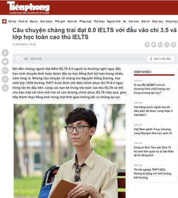 Nguyễn Hồng Dương có đầu vào IELTS chỉ 3.5 nhưng sau 13 tháng luyện IELTS cùng Smartcom đã đạt điểm đầu ra 8.0 ngay trong lần thi đầu tiên. Cũng như Hồng Dương, cả lớp 10D6 trường THPT Xuân Đỉnh niên khóa 2019 – 2022 chỉ có điểm IELTS đầu vào từ 2.5 đến 4.0. Nhưng sau 13 tháng học IELTS, mà chủ yếu là diễn ra qua Zoom vì năm 2020 và 2021 là những năm dịch Covid bùng phát, thì hầu hết các thành viên trong lớp đạt điểm IELTS từ 7.0 đến 8.0, trong đó có 3 bạn đạt 8.0. Câu chuyện thành công này có sức truyền cảm hứng to lớn về việc chinh phục IELTS điểm cao trong một thời gian ngắn dù có xuất phát điểm không cao, và đã được báo Tiền Phong và Đài truyền hình Hà Nội đăng tải. Xin mời xem video dưới đây.