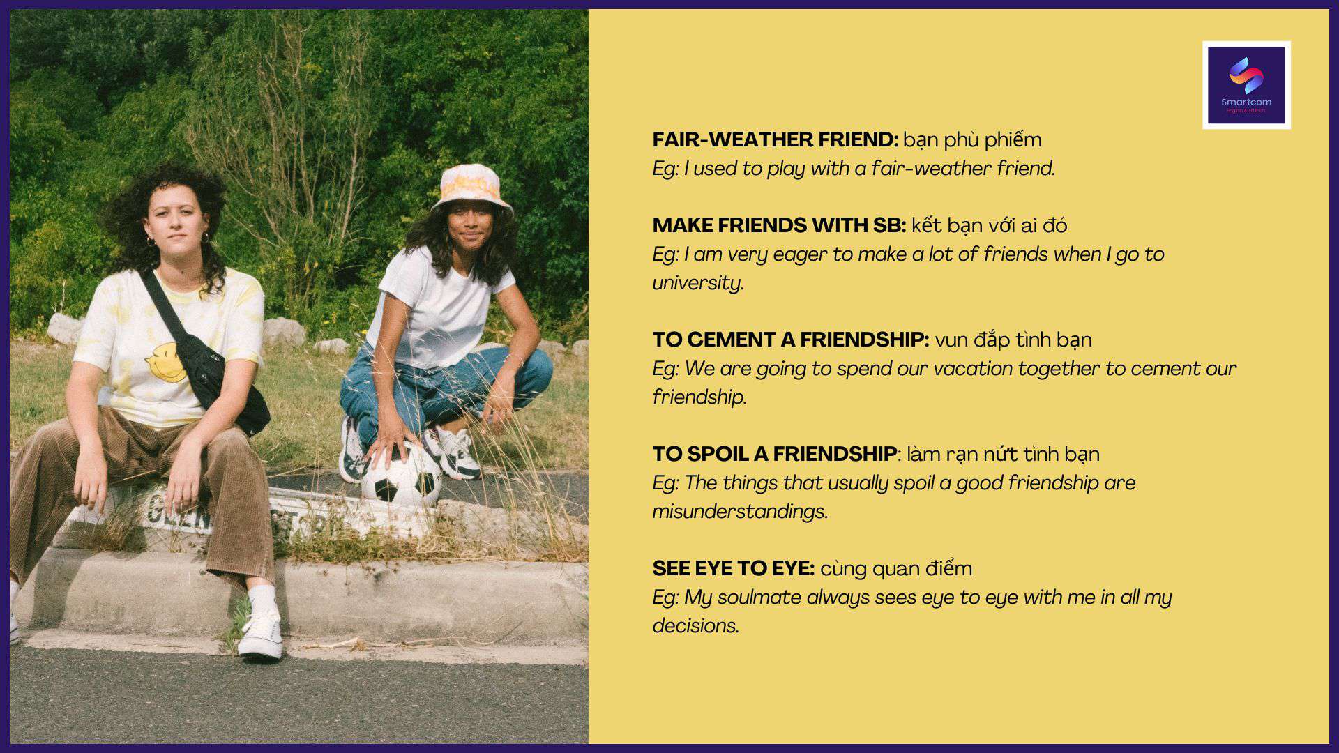 Trên đây là các từ vựng về chủ đề “Friendship” mà Smartcom English đã tổng hợp. Chúc các bạn học Tiếng Anh thật tốt và hãy theo dõi Smartcom English để cập nhật những kiến thức tiếng Anh bổ ích và những thông tin mới nhất về kỳ thi IELTS nhé!