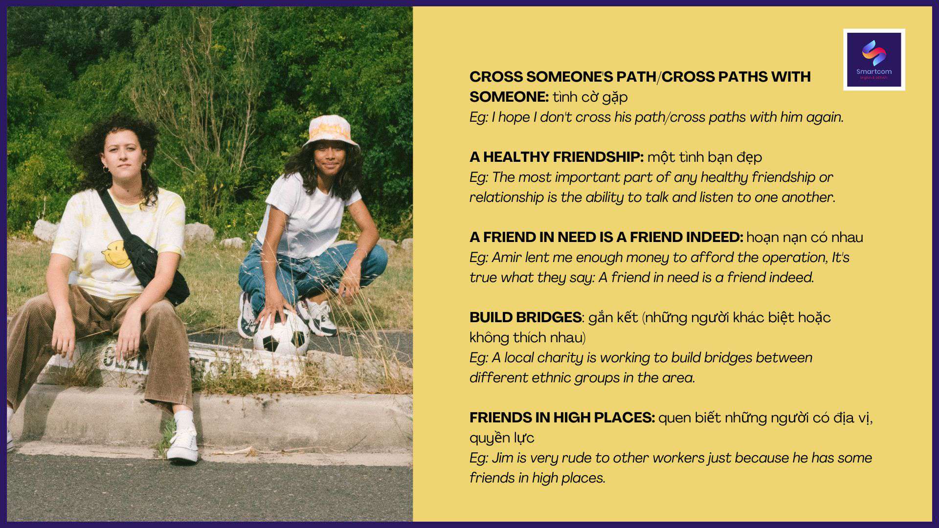 Bài thi IELTS rất hay hỏi về bạn bè của mình, và trong cuộc sống khi giao tiếp ta cũng rất hay nói về bạn bè. Vài cách diễn đạt hay ho và từ vựng chủ đề FRIENDSHIP dưới đây sẽ bổ sung cho các bạn những cách diễn đạt chất lừ, để người nghe gật gù lia lịa luôn nhé.