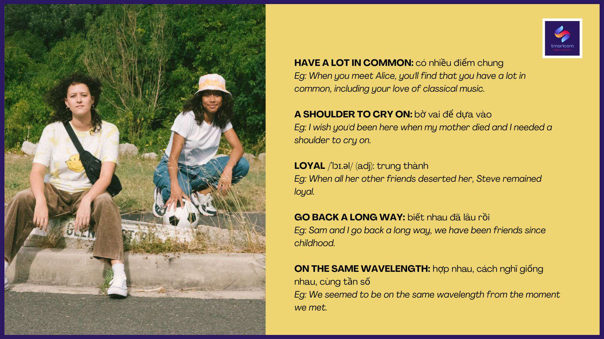 Get on like a house on fire: Nhanh chóng trở nên thân thiết và hợp nhau.̣̣ Eg:They got on like a house on fire at the party. Be as thick as thieves: Bạn cực kỳ thân thiết, chia sẻ mọi thứ với nhau. Eg: They've been as thick as thieves since childhood. Through thick and thin: Luôn ở bên nhau, ủng hộ nhau trong mọi hoàn cảnh. Eg: She stood by me through thick and thin. Like two peas in a pod: Hai người rất giống nhau và thân thiết. Eg: Those two are like two peas in a pod—they think alike and do everything together. See eye to eye (with someone): Đồng tình, hiểu ý nhau. Eg: We see eye to eye on most things. Speak the same language: Có cùng quan điểm hoặc sở thích, dễ thấu hiểu nhau. Eg: Though from different backgrounds, they speak the same language when it comes to music. Build bridges: Kết nối, tạo mối quan hệ tốt đẹp.Eg: The activities helped students build bridges with one another. Birds of a feather (flock together): Người có chung tính cách, sở thích thường gắn bó với nhau. Eg: Those two are birds of a feather—they both love hiking. A shoulder to cry on: Người bạn luôn lắng nghe, chia sẻ lúc khó khăn. Eg: When things went wrong, she was a shoulder to cry on. Strike up a friendship: Bắt đầu một tình bạn mới. Eg: He struck up a friendship with a classmate on the first day. A friend in need is a friend indeed: Bạn thật sự là người ở bên khi ta gặp khó khăn. Eg: She helped me when I was struggling—a friend in need is a friend indeed. Fair-weather friend: Bạn chỉ ở bên khi thuận lợi, biến mất lúc khó khăn. Eg: He realized she was a fair-weather friend when she vanished during his crisis. Friends in high places: Có bạn bè có địa vị hoặc quyền lực.Eg: Having friends in high places can sometimes open doors you never knew existed. Go way back: Biết nhau từ rất lâu, bạn lâu năm.Eg: We go way back—we’ve known each other since school. Kindred spirit: Người bạn tâm giao, đồng điệu trong suy nghĩ. Eg: Meeting her felt like finding a kindred spirit. Ride or die: Bạn tri kỷ, luôn ở bên bất kể hoàn cảnh nào. Eg: She’s my ride or die—always has my back. Partner in crime: Bạn thân cùng làm những trò nghịch ngợm, tinh quái. Eg: Whenever we go out, she’s my partner in crime. Damon and Pythias: Tình bạn trung thành, hiếm có. Eg: Their loyalty was legendary—like Damon and Pythias.Trên đây là các từ vựng về chủ đề “Friendship” mà Smartcom English đã tổng hợp. Chúc các bạn học Tiếng Anh thật tốt và hãy theo dõi Smartcom English để cập nhật những kiến thức tiếng Anh bổ ích và những thông tin mới nhất về kỳ thi IELTS nhé!